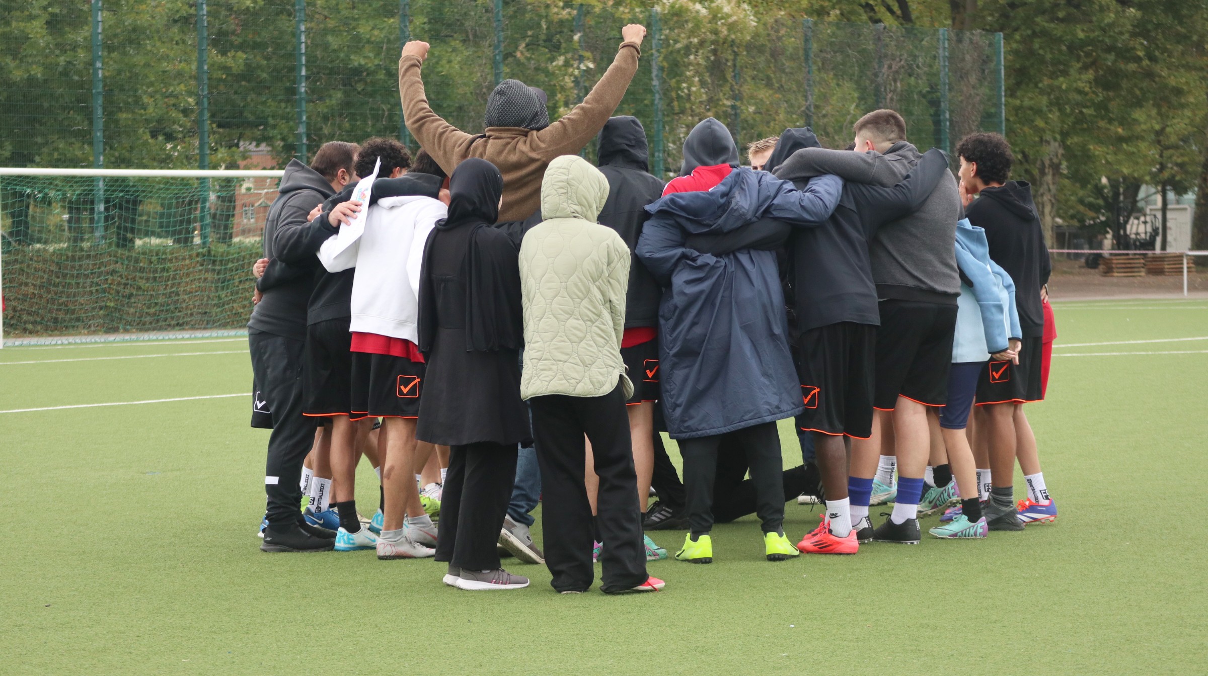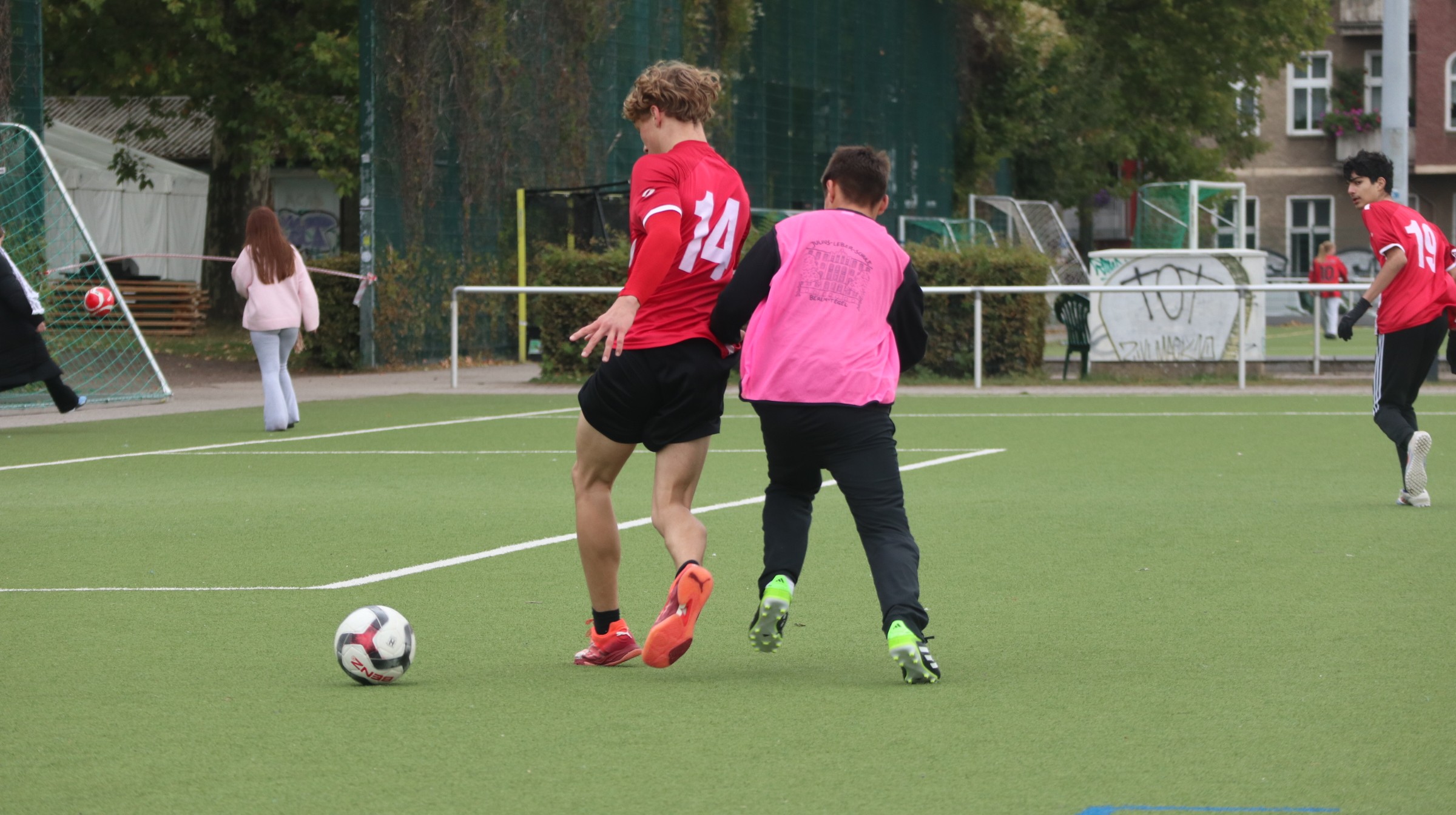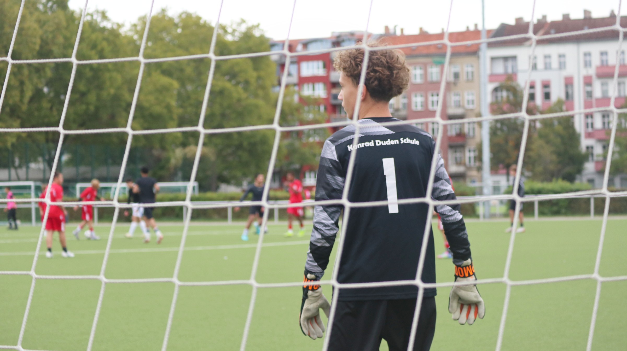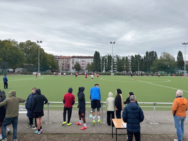 Trotz reg­ne­ri­schem Herbst­wet­ter ent­wi­ckel­te sich ein packen­des Tur­nier mit zehn Teams, die in zwei Grup­pen antra­ten. Wäh­rend die Gus­tav-Frey­tag- und die Koper­ni­kus-Ober­schu­le jeweils nur ein Team stell­ten, schick­ten die ande­ren Schu­len gleich zwei Mann­schaf­ten ins Ren­nen. Das sorg­te für ein hohes sport­li­ches Niveau und span­nen­de Spie­le. Schon in der Vor­run­de ging es inten­siv zur Sache, und die drei Schieds­rich­ter hat­ten alle Hän­de voll zu tun, um das Gesche­hen fair zu leiten.