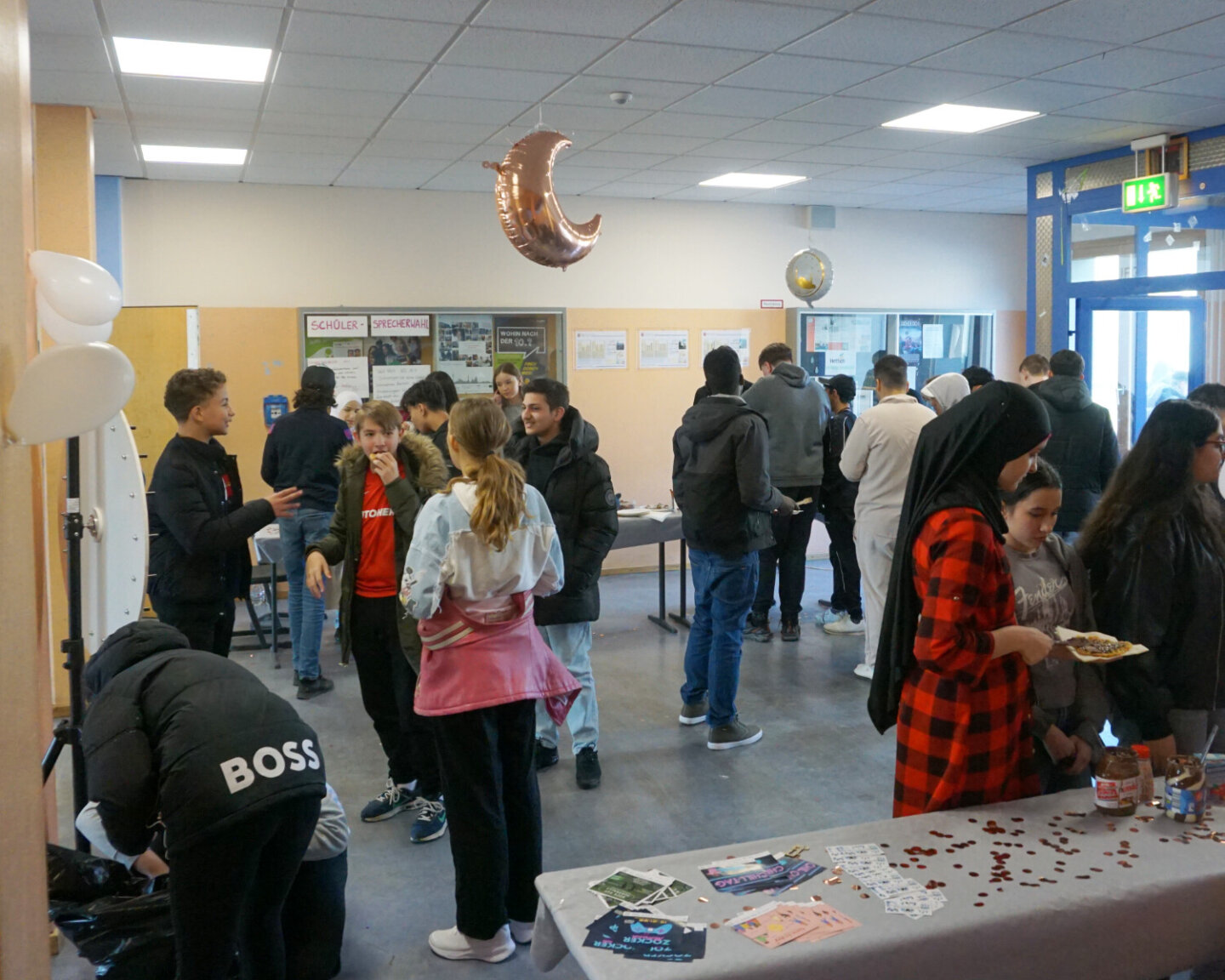 Alle Jahrgänge der Schule waren beteiligt. In zeitlich gestaffelten Gruppen – beginnend mit dem 7. Jahrgang in der ersten großen Pause – kamen die Schüler/innen im Foyer sowie im Aufenthaltsbereich der Schulsozialarbeit zusammen, um gemeinsam zu feiern.
